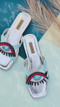 Discover artisanal craftsmanship with our hand-embroidered Eyes slides. Each pair features meticulously detailed eyes with black pipe lashes, sky blue tie-dye pupils, and gradient blue irises. Pink and black beaded outlines accented with golden cut pipes create striking visual depth. The shiny blue cushioned cross strap offers comfort and style, while the ultra-lightweight hand-cut crepe sole keeps you effortlessly mobile. A wearable work of art that transforms everyday steps into a statement.